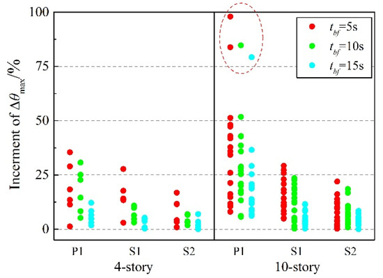 Based on the observed behavior of the engineering judgment, brace failure not only seriously weakens the stiffness of the failure story but also causes the stiffness of adjacent stories to decrease, which is not conducive to the integrity of the structure. Figure 17 shows the increment of the Δθmax in the adjacent (upper or lower) stories of failure story to be relative to the undamaged structure under the failure of different story braces. For the 10-story P1, after the failure of the first-story brace under the condition where tbf = 5 s, 10 s, and 15 s, the Δθmax of the second story is 0.0241 rad, 0.0235 rad, and 0.0243 rad, and the corresponding increment of Δθmax is 83.85%, 84.68% and 79.21%; after the failure of the second-story brace under the condition where tbf = 5 s, the Δθmax of first story is 0.0260 rad, and the corresponding increment of Δθmax is 97.95%. The Δθmax of these four prominent data points (circled by dotted lines in Figure 17) exceeds the limit value of the elasto-plastic story-drift angle specified in GB 50011-2010, which means that a soft-story mechanism caused by brace failure faded away from the failure story into the adjacent undamaged stories.