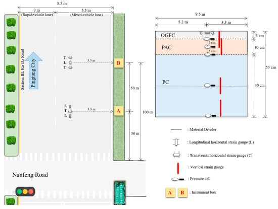 The layout of the instruments used in this study is shown in Figure 1. Each layer was equipped with eight vertical strain transducers (KM-100 B), also from Tokyo Sokki Kenkyujo Co., Ltd. (Tokyo, Japan) to measure the dynamic strains. Ten earth pressure cells (Model 3500 Series) from Geokon, Inc. (Lebanon, NH, USA) were installed to measure the vertical stress at the PAC of upper, middle, and lower layers. All gauges were installed in the mixed-vehicle lane and in the right wheel path, and evenly distributed between the two areas (area A and area B). During the tests, two data acquisition systems DSPL-24 from Geomaster were used to acquire the data from strain transducers and pressure cells in the permeable road pavement. DSPL-24 can measure the velocity and acceleration at a high resolution. The sampling rate of DSPL-24 was 50 samples per second.