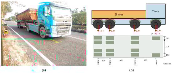 The dynamic load experiment was carried out on 25 October 2019. During the experiment, the average atmosphere temperature was 27.5 °C, and there was no rainfall. The 35-ton semitrailer truck from the Seven Seas Company (see Figure 2a) was used. The weight of the semitrailer truck was determined according to the limited total weight of the semitrailer of Road Traffic Safety Rules of the Ministry of Justice of the Republic of China (Taiwan) []. Figure 2b shows the configuration of the truck axles, and individual static wheel load was calculated using the lumped mass method. There were fourteen 315/80 R22.5 wheels in the experiment truck. The static loads for each wheel and the standard pressure of the wheels are listed in Table 6.