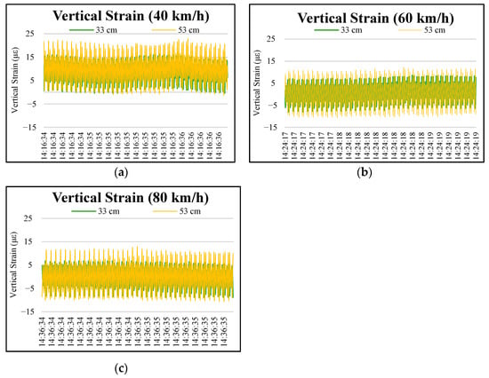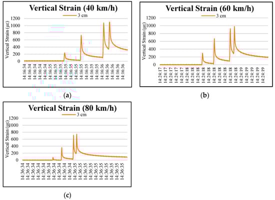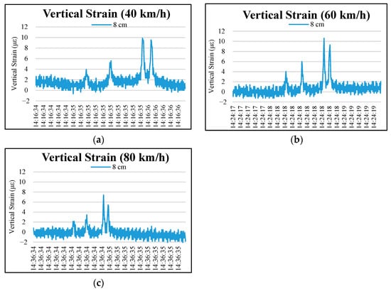 Typical vertical strain distributions at a depth of 8 cm in the permeable road pavement under different speeds: (a) truck speed of 40 km/h, (b) truck speed of 60 km/h, and (c) truck speed of 80 km/h.