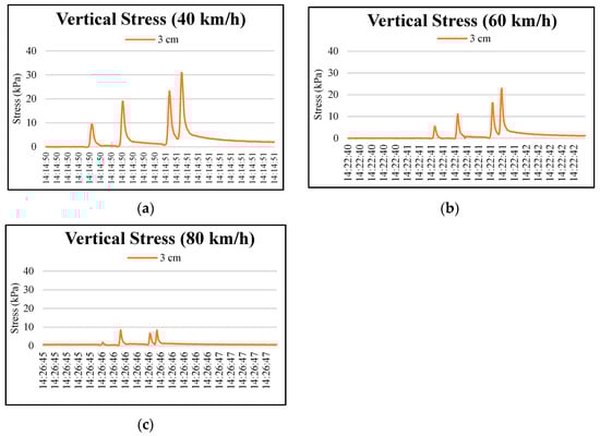 Typical vertical stress distributions at 3 cm depth in the permeable road pavement: (a) 40 km/h truck speed, (b) 60 km/h truck speed, and (c) 80 km/h truck speed.