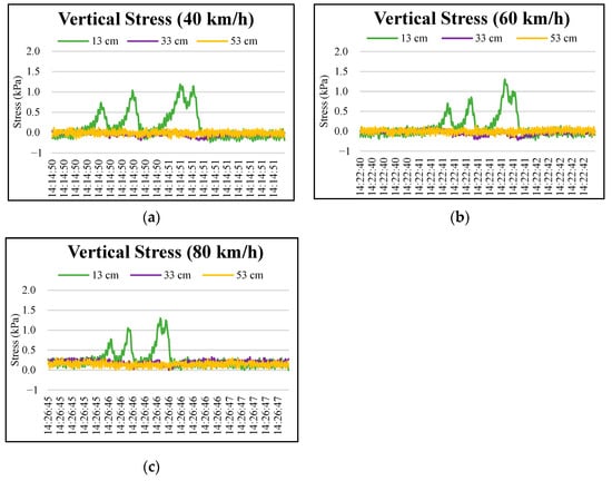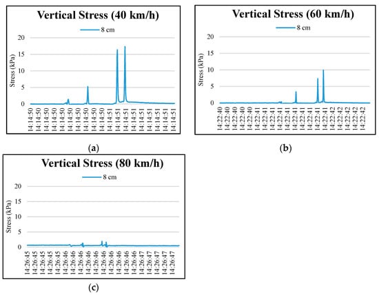 Typical vertical stress distributions at 8 cm depth in the permeable road pavement: (a) 40 km/h truck speed, (b) 60 km/h truck speed, and (c) 80 km/h truck speed.
