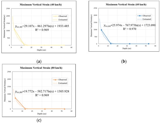 Relationships between vertical strains and permeable road pavement depths: (a) model for 40 km/h, (b) model for 60 km/h, and (c) model for 80 km/h.