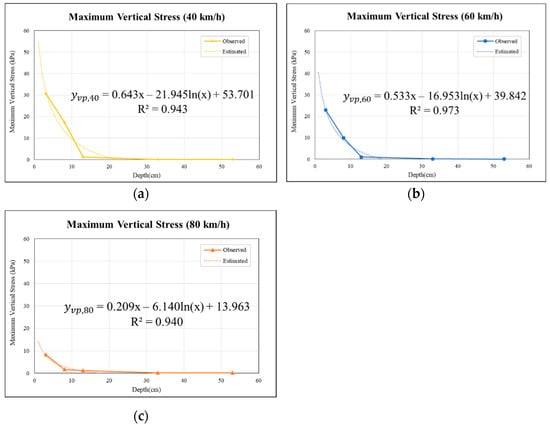 Relationships between vertical stresses and permeable road pavement depths: (a) model for 40 km/h, (b) model for 60 km/h, and (c) model for 80 km/h.