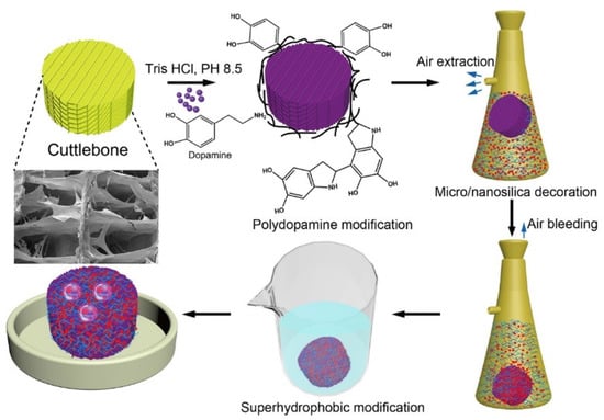 2.3. Preparation of Superhydrophobic and Oleophilic Cuttlebone