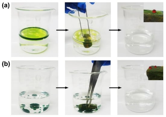 - Zhu, H.; Chen, D.; An, W.; Li, N.; Xu, Q.; Li, H.; He, J.; Lu, J. A robust and cost-effective superhydrophobic graphene foam for efficient oil and organic solvent recovery. Small 2015, 11, 5222–5229. [Google Scholar] [CrossRef]