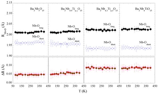 octahedra, seems to be the case for all the samples, albeit the Ti substitution affects substantially the local Nb-O bonds distribution. This observation is evident from the separation between the longer and shorter Nb-O bondlengths (lower panels). The mean Nb-O separation is ∼0.05 Å for