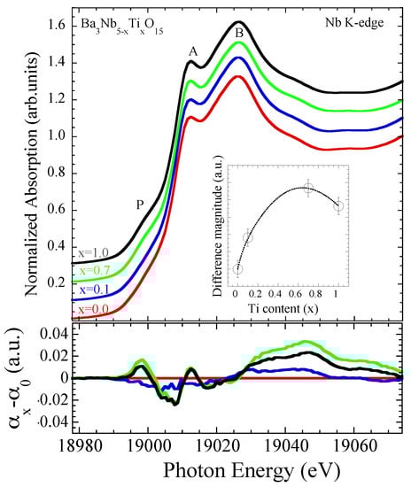 Figure 7 (lower). The maximum difference ranges between 2–4% with a clear change in the shoulder feature P as well as continuum beyond the feature B. Indeed, the shoulder feature P intensity increases with Ti substitution as the case of the spectral weight beyond the peak feature B. The increased intensity of feature P is consistent with the increased Nb octahedral distortions observed by EXAFS. The increasing spectral difference reflects changes in the local geometry as well as the valence electronic states. This can be seen further from the integrated absolute spectral difference plotted as a function of Ti substitution in the inset of