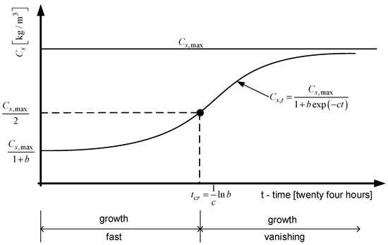 An important parameter of the logistic curve presented in Figure 1 is the quantity Cs,max/2, which defines the mass of solid phase observed at the critical time tcr. For further analysis, the index described by Formula (17) was used: