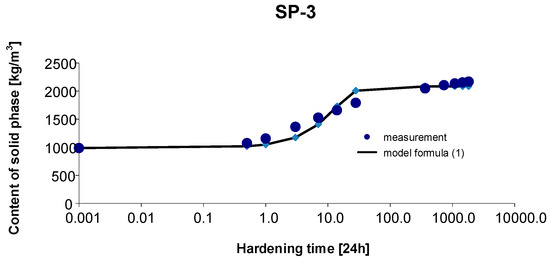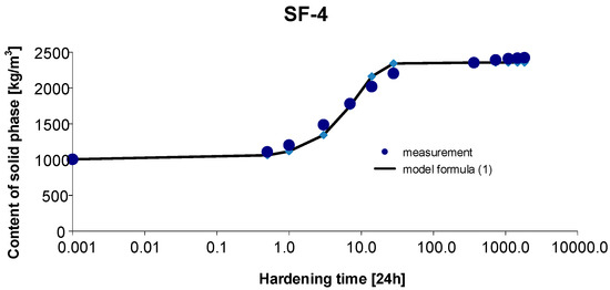 The graph of the approximating Function (4) with the measurement points of the content of solid phase as a function of hardening time is presented in Figure 3.
