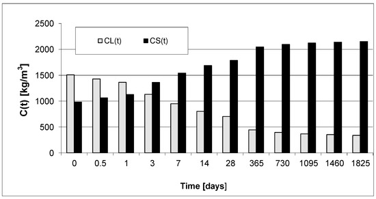 It should be noted that the solid phase at the beginning of the process Cs,0 is composed only of coarse aggregate. Moreover, the critical time tcr is the time in which the analyzed quantity Cs (t) reaches the value of the half of Cs,max.