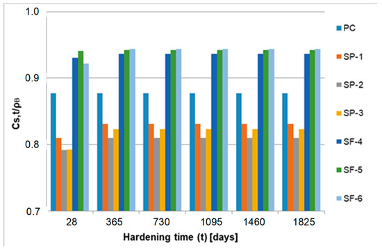 Significantly less solid phase (only about 42%) is observed in concretes SP-1, SP-2 and SP-3 containing a superplasticizer, which appears to be effective in inhibiting the formation of solid phase in the initial time of transformation. In concretes SF-4, SF-5 and SF-6 containing both a superplasticizer and microsilica, a clear impact of microsilica is observed, which, due to its large specific surface, clearly weakens the inhibitory effect of the superplasticizer. The largest volume of solid phase mass during the critical time is gained in concrete SF-5, and the least in concrete SF-6. In concrete SF-4, a lower value by about 18% was observed, and in concrete SF-6, a value as much as about 37% lower was observed as compared to concrete SF-5. In subsequent analyses, we found that the highest value of the index Cs,t/ρB was reported for PC concrete (without chemical admixtures and without mineral additives). It is clearly visible already after 3 days of hardening. After 28 days of hardening, this value stabilizes and practically does not change until the end of the observation (5 years). In the group of concretes SP-1 ÷ SP-3 (concretes containing a superplasticizer), more pronounced differences in the values of the index Cs,t/ρB are observed only after 28 days. After 5 years, they reach the values of about 0.81 ÷ 0.83. In the group of concretes SF-4 ÷ SF-6 (concretes containing both a superplasticizer and microsilica), clear differences can be observed after 3 days of hardening. For concrete SF-6, an evidently higher value of the index Cs,t/ρB was observed over 7, 14 and 28 days. The values of this index stabilize after 1 year and they practically do not change until the end of the observation (5 years). After 5 years, the indexes reach the value of approximately 0.94 for all concretes from this group (concretes SF-4 ÷ SF-6). The analysis of the obtained test results indicates the active impact of the superplasticizer and microsilica on the kinetics of phase transformation processes, i.e., the transformation of cementitious material from a viscous liquid to a pseudo-solid body. The particles of superplasticizer are adsorbed on the binder grains and bring about their deflocculation by imparting an equal charge to their surfaces, which causes repulsive forces. Nevertheless, we observed that the superplasticizer blocks the progress of the phase transformation process due to its adsorption on the surfaces of binder grains. This is visible in the graphs presenting the relative mass increments of the solid phase, especially in Figure 12, i.e., in the first 14 days of the transformation process. The slowing and blocking effect of the superplasticizer is evident when comparing the values of Cs,max/ρB obtained for concretes PC (w/s = 0.52) and 1 (w/s = 0.52). The value of this parameter for concrete PC is approximately 0.88, while for concrete 1 (containing a superplasticizer), it is only approximately 0.83. The pozzolanic microsilica reacts with portlandite Ca(OH)2, and hence, the size of Ca (OH)2 crystals and the degree of their orientation in relation to the aggregate grains are both decreasing, thereby strengthening this weak zone in the concrete. Microsilica with a large, developed surface easily reacts with Ca(OH)2, increasing the amount of hydrated calcium silicates of the CSH type (i.e., CaO-SiO2-H2O). The effect involving the impact of microsilica in the presence of a superplasticizer is revealed during the analysis of the parameter Cs,t/ρB, since the highest values of the Cs,t/ρB index were observed in the group of concretes SF-4 ÷ SF-6. After 5 years of observation, the value of this index for these concretes is approximately 0.94.