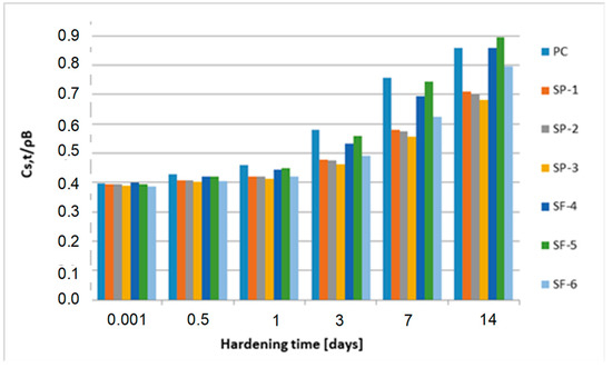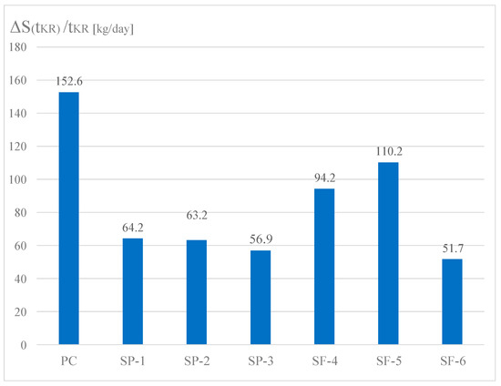 The above parameter defines the rate of mass increment in the solid phase in the critical time (Figure 15). It turns out that during this time, the greatest increment in the solid phase is observed for plain concrete (PC), which does not contain chemical additives or natural admixtures.