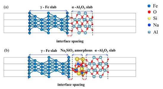 The first-principles calculations based on density functional theory have been used successfully for the solid-solid interfaces, which indicate the atoms and electric and mechanical structures. Li et al. [13] found that compared with the Al-terminated structure of the Al2O3-Fe interface, the O-terminated structure shows better tensile properties, in which the critical strain of the O-terminated structure is 9.5% higher than that of the Al-terminated structure, and the ideal tensile strength is 3.5-fold that of the Al-terminated structure. In a further study, Tran [11] found that the Fe atoms on the surface have three covalent bonds with the below oxygen atoms to form covalent bonds with other oxygen atoms. Zhao et al. [14] reported that the wear resistance of the Fe matrix can be improved by doping Ti and Ni. The improvement in wear resistance is a result of the elements being added, which strengthens the interfacial bonding strength between the carbide and the substrate. Wan et al. [15] showed that the silicate can react with the Fe3O4 surface to form a eutectic mixture, Fe2SiO4, which improves the friction reduction and anti-wear performance. To the best of our knowledge, research on the addition of amorphous Na2SiO3 to the Fe-Al2O3 interface to improve the bonding strength of Fe-Al2O3 has not been reported. In the research on alumina-ceramic-reinforced iron matrix composite interface, amorphous sodium silicate was found, which makes the interface bond more tight [16]; we speculate that amorphous sodium silicate will have an effect on the interface bond.