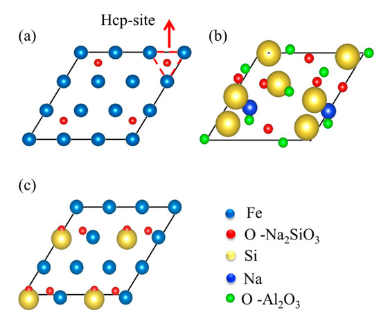 The crystal structure of γ-Fe, Na2SiO3, and α-Al2O3 is shown in Figure 1. The γ-Fe (a = b = c = 3.439 Å) belongs to FM-3M (No. 225) space groups and the Na2SiO3 (a = 6.027 Å, b = 10.487 Å, c = 4.784 Å) and α-Al2O3 (a = b = 4.814 Å, c = 13.156 Å) belong to Cmc2-1(No. 36) and R-3 C (No. 167) space groups, respectively, as shown in Table 1. In this work, the Na2SiO3 is amorphous; the Na2SiO3 occurs as a structural transformation from crystalline to amorphous phase by forcite mode in the materials studio. The crystal structure transformation is more beneficial to simulate an approximation to the real crystal state. To meet the rigor of the research, the interface structure consistent with previous reports is selected in this work [13]. For the crystal surface and the layer, the γ-Fe (111) and α-Al2O3 (0001) surfaces with the lowest energy are selected in exponential crystal planes [24,25]. When the Fe (111) and Al2O3 (0001) surfaces are 7- and 5-layer, the surface convergence and the stability test are satisfied. The γ-Fe (111) combines directly with the α-Al2O3 (0001) by the O-terminated structure, and the amorphous Na2SiO3 is inserted into the middle between them, as shown in Figure 2. In addition, there are three stacking models for the O-terminated Fe-amorphous Na2SiO3-Al2O3 and Fe-Al2O3 interfaces, as shown in Figure 3. The ideal adhesion work (Wad) is calculated to judge bonding strength and scales as in [26,27]: