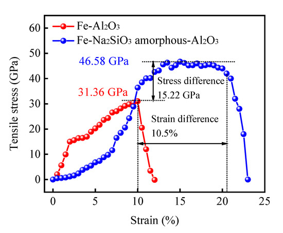 The safety index and the mechanical properties of materials can be evaluated by the tensile test. Figure 6 presents the tensile stress related to strain of the Fe-Al2O3 and Fe-amorphous Na2SiO3-Al2O3 interfaces. The tensile strength of the Fe-Al2O3 interface increases gradually with the strain and reaches its maximum value of 31.36 GPa at the critical strain of 10%. Then, the tensile strength decreases sharply to zero as the strain is more than 10%, illustrating that the bonding strength for the Fe-Al2O3 interface is far from satisfactory. It is worth noting that Li et al. [13] reported that the maximum value of tensile strength is 31.16 GPa at the critical strain of 10% for the Fe-Al2O3 interface, which coincides with the calculation results and demonstrates the veracity of the calculation. The tensile strength of the Fe-amorphous Na2SiO3 interface increases slowly when the strain is less than 10%. This is because the amorphous structure exhibits excellent stress-release properties. When the strain is between 10% and 20%, the tensile strength is maintained at approximately 46.58 GPa. The reason for this is that the amorphous structure efficiently alters the atomic location and slows down the deformation when it is impacted by external forces. Obviously, it is another excellent property of the amorphous Na2SiO3 interface. Finally, the maximum tensile strength is 46.58 GPa for the Fe-amorphous Na2SiO3-Al2O3 interface at the strain of 20%, which is 1.5-fold that of the Fe-Al2O3 interface. In summary, the bonding strength of the composite materials is effectively improved as a result of the addition of amorphous Na2SiO3, which lays a good foundation for wear resistance during service.
