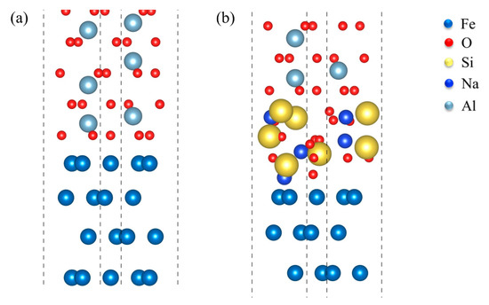 The model of the (a) Fe-Al2O3 and (b) Fe-amorphous Na2SiO3-Al2O3 interfaces.