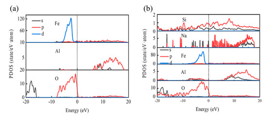 Furthermore, the hybridization of the electrons and chemical bonding at the interfaces are explored by utilizing the partial density of states (PDOS). Figure 12 presents the partial density of states (PDOS) at the Fe-amorphous Na2SiO3-Al2O3 and Fe-Al2O3 interfaces. The black solid line depicts s-states, the red solid line represents p-states, the blue solid line shows d-states, and the black dotted line defines the Fermi level. The PDOS of the d electrons of Fe and the p electrons of O bulges and exceeds zero at the Fermi level, as shown in Figure 12a. Therefore, the metallic bonding between the Fe and O atoms appears at the interfaces. Moreover, orbital hybridization exists between the Fe-d and O-p in the region of −6.2 eV to 0.5 eV, which reveals that a covalent connection is created. Therefore, a combination of metallic bonds and covalent bonds occurs at the interface. In the Fermi level region, the PDOS of the Al atom does not appear when compared to the Fe atom, implying that the Al chemical bonding is barely noticeable.