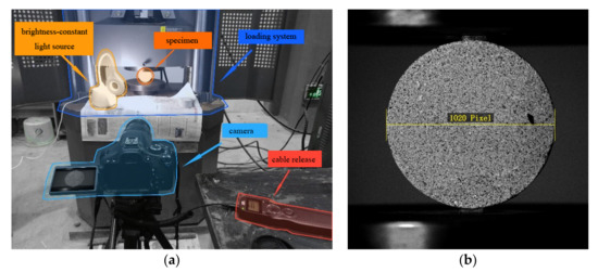 In the system shown in Figure 2a, the shutter speed of the lens was 1/800 s, the aperture size was f/5, and the ISO was 3200. The exposure interval of the camera was set as 1 s. Due to the relatively small size of the specimens, the measuring field range was set over the entire surface. As shown in Figure 2b, the collected images were set as 8 bit grayscale images with a resolution of 1440 × 1440 pixels, and the diameter of the specimens occupied 1020 pixels. After calibration, the object plane resolution of the system was 0.0725 mm/pixel.