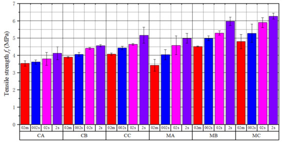 After calculation, Figure 5 presents the tensile strength and standard deviation of each group of specimens; the tensile strength of mortar was generally higher than that of concrete under the same water/cement ratio. The average tensile strength of mortar under loading rates of 0.2 mm/min, 0.02 mm/s, 0.2 mm/s, and 2 mm/s was 10.3%, 17.8%, 21.3%, and 21.8% higher than that of concrete, respectively. Due to the presence of the interface around aggregates, the damage of concrete developed faster at higher loading rates, which made the strength of concrete lower than that of mortar. At water/cement ratios of 0.64, 0.56, and 0.41, the average tensile strength of the mortar specimens was 13.6%, 21.4%, and 22.6% higher than that of the concrete, respectively. All specimens with lower water/cement ratios had higher tensile strength because the interfacial strength increased with decreasing water/cement ratio, making specimens more difficult to crack.