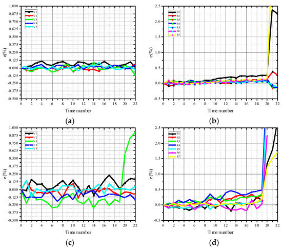 The characteristic points were marked on the test piece, as shown in Figure 6, and the strain–time curves of the characteristic points were extracted, as presented in Figure 7. The loading time of the failure progress was divided into 22 moments, and the peak load was at approximately the 17th moment.