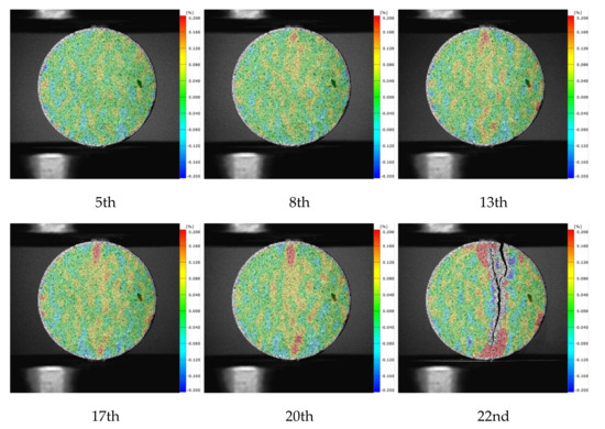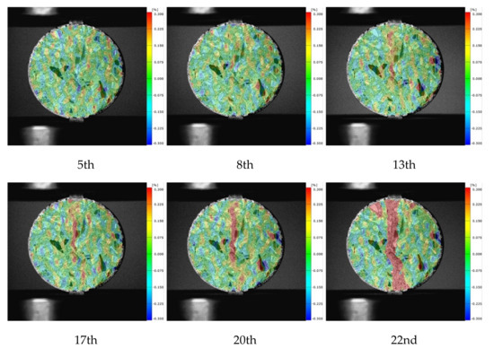 Figure 8 presents the strain maps of mortar. It can be noted that the localization phenomenon at the loading end was obvious. Near the loading strip, the cracks often deviated from the center of the specimen, resulting in secondary cracks. The largest tensile strain on mortar specimens was 0.0237 along the diametral loading direction, which meant the mortar specimens began to crack at this moment. This is very close to the value in the literature [14]. For the strain maps of concrete specimens shown in Figure 9, the localization phenomenon at the end was improved successfully. There was no deviation from the center or secondary cracks. Therefore, the existence of aggregate improved the crack development process and made the test results more reliable. After the peak time, the high strain zones extended from the periphery of the aggregate to the end. The largest tensile strain was 0.0836 along the diametral loading direction. According to the strain maps and strain–time curves, the failure process could be divided into three stages. In the first stage, the internal stress level of the specimens was small, and the specimens were in the stage of linear elastic deformation under tension. At this time, the number of microcrack initiation was small, and stress increased relatively slowly. In the second stage, the internal stress level of the specimen increased, and the stress localization was obvious. Although macro cracks did not yet occur, a large number of internal microcracks were already initiated. The third stage came after reaching the peak stress, the microcracks propagated and converged rapidly, and a macro crack occurred.