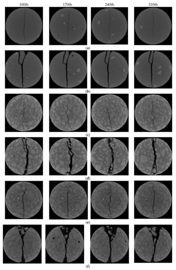 CA specimens (concrete, water/cement ratio = 0.64), CC specimens (concrete, water/cement ratio = 0.41), and MA specimens (mortar) under loading rates of 2 mm/s and 0.2 mm/min were selected for the comparative study of CT slice images. Approximately 450 slice images were derived from each specimen along the thickness direction, and the typical slice images from the 250 images of the middle layer were extracted for analysis. Specifically, the 100th, 170th, 240th, and 310th slices of each specimen are presented in Figure 8. On a whole, all specimens had a main crack along the loading diameter direction when they were destroyed, and the distribution of cracks changed along the specimen thickness direction.