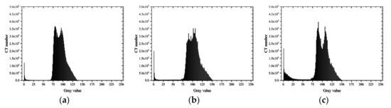 A histogram can display the data frequency of each group in a graphical form, which represents the distribution probability of the CT number of materials with different densities and expresses the change in the content of each phase through the change in CT numbers [41]. As different CT numbers corresponded to different material brightness, the range of CT numbers of the voids, mortar, and aggregate could be determined through the CT image histograms [18]. Additionally, when cracks were formed inside the specimens, the gray value decreased as the average density decreased [42]. Statistical analysis of gray histograms was carried out on the characteristic images of 100–300 layers of specimens under various working conditions. The results are shown in Figure 11, Figure 12 and Figure 13.