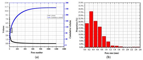 The pore volume curve was overall smooth, as presented in Figure 16a, which indicated that the variation in the internal pore size of the mortar was continuous. Moreover, the cumulative volume of pores was 247.41 mm3. According to Figure 16b, the number of pores had an approximately normal distribution. In addition, the pore size was mainly distributed in the range of 0.2–0.4 mm, accounting for 27.5% of the total pores, followed by the sizes of 0–0.2 mm and 0.4–0.6 mm, both accounting for about 20% of the total pores. However, the size of almost all pores was below 1 mm. This also indicated that the matrix was compacted; hence, the strength was relatively high.