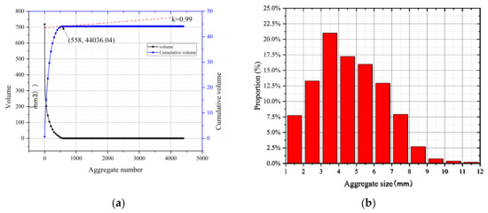 Statistical curves of aggregate distribution: (a) aggregate volume and cumulative volume distribution curves; (b) proportion of the aggregate size.