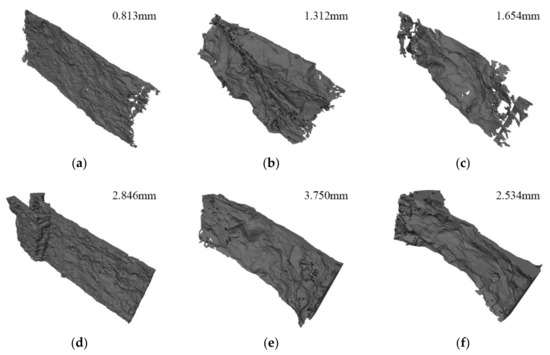 The 3D morphology of reconstructed cracks: (a) MA-02 m; (b) CA-02 m; (c) CC-02 m; (d) MA-2 s; (e) CA-2 s; (f) CC-2 s.