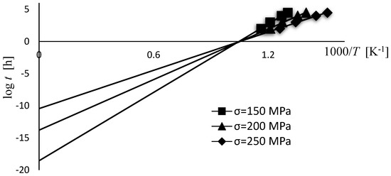 is obtained mostly from experimental creep testing data and is determined as the intersecting point of iso-stress lines with the y-axis on a log t vs. 1/T plot [16]. Moreover, most applications are made by first calculating the parameter that provides the best fit to the data, which means that is treated as a fitting value. The model is used under the assumption that the iso-stress lines, when extended, cross the vertical axis (at 1/T = 0) in a single point. However, as is evident from Figure 1, iso-stress plots intersect the vertical axis in some range depending on the applied stress. According to this, and as proposed by A. Ghatak et al. [17], value can also be taken as dependent on stress. Equation (4) can therefore be modified in the form considering the value as the function of stress ((σ)) and not as a constant value [18,19]: