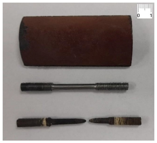 Sample of pipe made of 10CrMo9–10 steel (above), creep test specimen Type B 4 × 20 DIN 50125: 2016 (middle) and creep test specimen after creep testing (below).