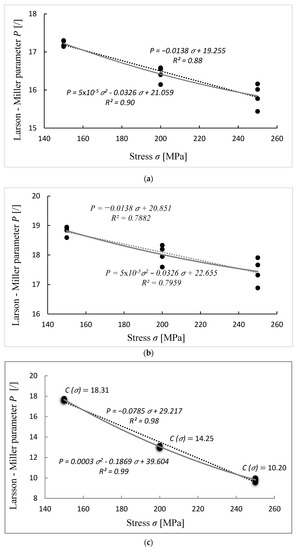 In view of the low amount of data (only three stress levels), the linear correlation function was used in further calculations. It would be also interesting to verify other extrapolation functions; however, this is out of the scope of this investigation.