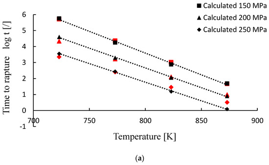 According to the time to rupture calculation procedure (Equation (13)), the computed time t was compared with the available creep–test data [18], as described in Section 2.1. The results in log t form are graphically presented in Figure 5 and Figure 6. For better visualization the calculated time to rupture values are also presented as the percent error (%) and listed in Table 2.