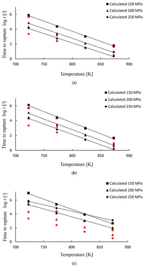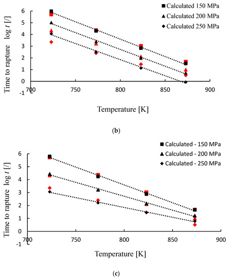 Creep model behavior and comparison with the available creep test results when considering the linear master curve (Equation (9)) are depicted in Figure 5. When the calculations are performed by assuming as a constant value of 20 (Figure 5b), the error starts to increase as we move toward low temperature values. For stress of 250 MPa and temperature of 723 K, the predicted rupture time (log t = 4.07) is considerably overestimated with respect to the creep testing data (log t = 3.35), while it is substantially underestimated for a high temperature of 873 K (log t = −0.06 vs. log t = 0.51). Good calculations are obtained in the mid temperature range 773–823 K. The estimated log t values for 823 K are 2.80 (150 MPa), 1.98 (200 MPa) and 1.14 (250 MPa) and the corresponding creep testing values are 3.01 (σ = 150 MPa), 2.10 (σ = 200 MPa) and 1.45 (σ = 250 MPa). The percentage error in the mid temperature range is between 14 and 53% and extends to about 75% for high-temperature (873 K) and even over 400% for low-temperature values (723 K). Much better results and a good model response are achieved when parameter is assumed to be 18 (Figure 5a). Noticeable deviations are observed only when calculations are performed at a low temperature of 723 K and sustained stress values (200 and 250 MPa), with the error exceeding 200%. Otherwise, error is within 10–60%, depending on the stress level, as shown in Figure 5a and Table 2. The best results and the smallest errors are obtained when performing calculations by considering as a function of stress (Figure 5c). A very good response is observed in almost all of the temperature and stress ranges analyzed.