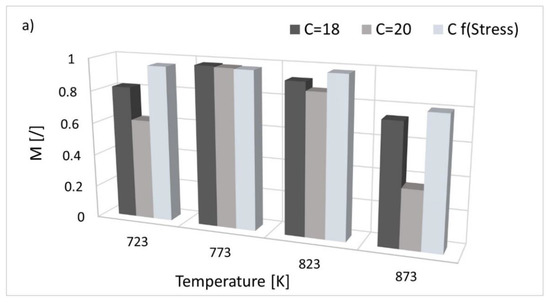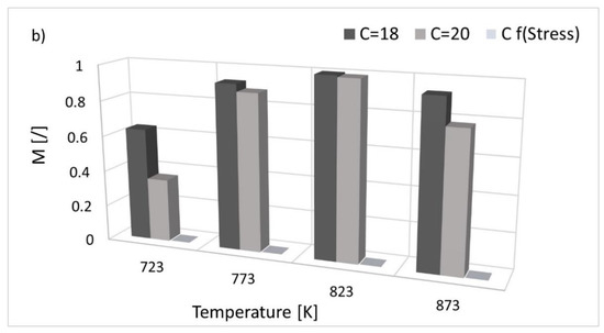 Based on the calculated values, a good fit and the most accurate results are obtained when considering the linear correlation function (Figure 7a). When is taken as a constant of 18, comparable results between model and experimental data are obtained for almost the whole temperature range. The values range from 0.98 to 0.74 (= 0.82, = 0.98, = 0.92, = 0.74). Even better comparability can be observed for the stress-dependent parameter , with being over 0.9. However, a considerably reduced fit ( < 0.6) for the boundary temperatures (723 and 873 K) is obtained when considering = 20. The use of the extrapolation curve where data are fitted by the polynomial function is reliable only for a certain temperature range and only when considering material parameter as a constant, as shown in Figure 7b. The best results are obtained when as constant values of 18 and 20 are used. For = 18 from 773 K to 873 K, the value of is over 0.92. For = 20 a good fit ( > 0.85) is obtained only for a temperature range of 773–823 K. However, when is assumed as stress-dependent, the computed values are largely overestimated. In this case, the values of fit adequacy parameter are zero for all data sets, indicating largely questionable validity of the model.