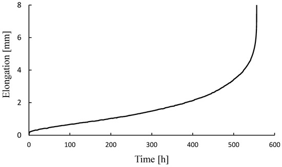 Finally, the validation process of the creep-model was performed by comparing the -model-estimated creep-rupture time with the real, experimentally obtained time. The creep test was performed at a temperature of 600 °C (873 K) and a stress level of 80 MPa. The creep-test result in the form of strain vs. time curve is shown in Figure 8. As shown, the time to rupture was about 560 h. The elongation A = 29.6% and contraction Z = 88.7%