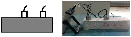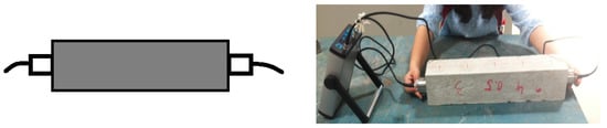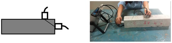 Although the indirect UPV measurements are poor sensitivity compared to the direct test, it is necessary to find the relationship between the UPV and the concrete properties by indirect UPV test because sometimes it is not possible to use the direct UPV measurements under some conditions. Both transducers are placed on the same surface of the FRC in this method, as shown in Figure 6.
