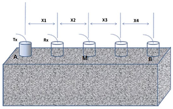 In this method, one transducer (Tx) was placed at position A and the other transducer (Rx) was placed at a distance of X1 away from position A, as shown in Figure 7. Then, change the location of the transducer Tx by a distance of X1 away from position A to position B. The average UPV and transmit time can be obtained from the path length of 200 mm by one transducer (Tx) is placed at position A and the other transducer (Rx) is placed at position M. Then, change the transducers to different locations so that the spacing between two transducers will be 200 mm. Theoretically, the UPV should be the same, and the transmit time will increase as proportional to the spacing between two transducers.