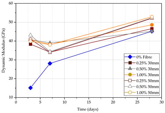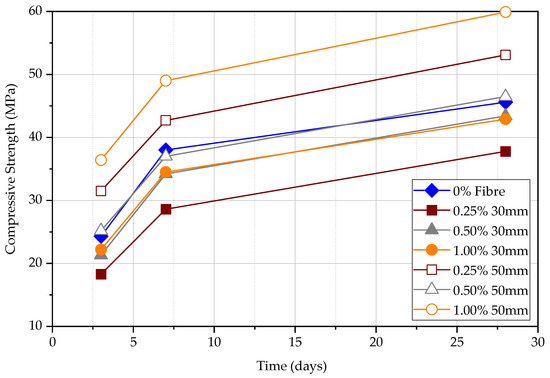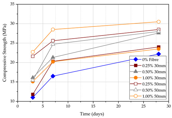 Compressive strength was measured at 3, 7, and 28 days as shown in Figure 8. The compressive strength of FRC will increase with the time from 3 days to 28 days, which agrees with existing knowledge. The specimen, which contains 0.25% of 30 mm fibre, shows the lowest strength in 3, 7, and 28 days compared to all other specimens. The compressive strength of concrete with 50 mm fibre is higher than that of the 30 mm fibre []. As the fibre content increases, the compressive strength of the concrete increases due to the effect of confinement although fibres are assumed to be effective only in increasing the toughness of concrete. As a result, steel fibres can significantly increase concrete capacity for tension and flexure; however, the increase in compression capacity is comparatively lower.