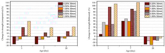 The percentage change in strength relative to the plain concrete was calculated in each FRC specimen as shown in Figure 10. The change in the compressive strength results is relatively small in comparison to the results of the rebound hammer test at the age of 3 and 7 days; however, the variation is similar at the age of 28 days. The compressive strength of normal Portland cement concrete reaches 90% at the age of 28 days relative to the strength in long term. The observation could be attributed to the method of measurement in each technique where direct compressive strength considers the effect of the full specimen while the rebound hammer test considers only the surface. In long term, the effect of fibre on the rebound hammer result is minimum while in short term the effect is significant. This could be because adjacent fibres can resist the rebound hammer pressure although the concrete medium is weak. This observation can confirm that the rebound hammer test is not suitable to obtain compressive strength data in FRC at an early age.