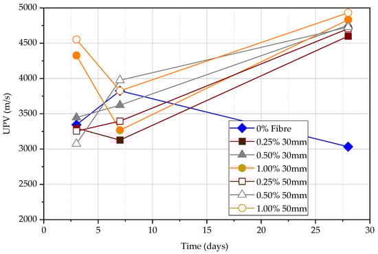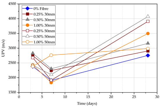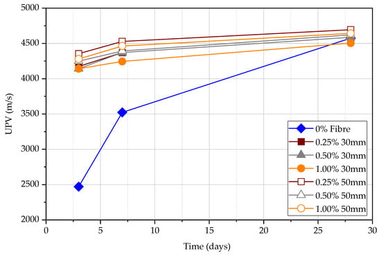 It is stated that when the compressive strength increases, the UPV increases. The UPV result follows approximately the same pattern for each kind of FRC at a given test age as shown in Figure 11. However, UPV measured in plain concrete shows that the difference between UPV in comparison to FRC is significant as shown in Figure 12. The difference in UPV between plain concrete and FRC is approximately 70%, 25%, and 0% for concrete at the age of 3 days, 7 days, and 28 days, respectively. Steel fibres within the concrete matrix can increase the UPV of specimens, especially at an early age even at the low maturity of concrete. This is because pulse wave travels much faster within the steel medium than porous concrete medium as previous studies have shown. The volume fraction of steel fibres seems ineffective in increasing the UPV; however, longer steel fibres can slightly increase the UPV measurements. The UPV in specimens with 50 mm long fibres is larger by 5.7%, 3.8%, and 2.0% at the age of 3, 7, and 28 days, respectively, in comparison to the specimens with 30 mm long fibres. Although the plain concrete matrix is weak, the FRC composite shows a higher UPV at an early age. However, matured concrete shows that the fibre content does not affect the measured UPV. In general, the UPV results of FRC at all ages exceed 4000 m/s while it is more than 4500 m/s at 28 days, which declares that the quality of concrete is good.