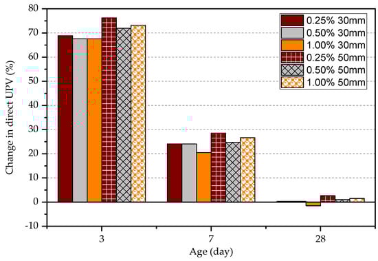 - The volume fraction of steel fibres seems ineffective in increasing the UPV. However, longer steel fibres can slightly increase the UPV measurements. The UPV in specimens with 50 mm long fibres is larger by 5.7%, 3.8%, and 2.0% at the age of 3, 7, and 28 days, respectively, in comparison to the specimens with 30 mm long fibres. This implies that the fibre content does not affect the measured UPV in matured concrete.