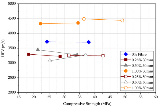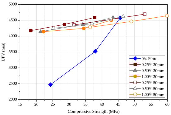 - The UPV and rate of strength gain in FRC have a significant difference at an early age of concrete. Both UPV and compressive strength increase when the fibre content increases without changing the fibre length. For the same fibre content, 50 mm FRC shows a higher UPV value and compressive strength than FRC with 30 mm fibre.