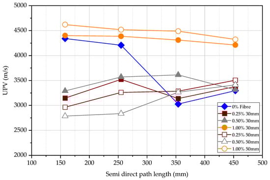 According to Figure 15 and Figure 16, the UPV of each type of FRC specimen is similar for different path lengths. Semi-direct UPV test data at 28 days of age is not available due to experimental misconduct. To increase the accuracy, an average UPV value could be used. However, the UPV decreases rapidly for the concrete specimen without steel fibre when measured path lengths increase. This may be attributed to the significant loss of signal due to the path length in the absence of steel fibres. Although the concrete with and without steel fibre could be named isotropic, the path length significantly influences the UPV of different types of concrete. Hence, the average semi-direct test data will be used for each kind of beam for further discussion and ignore data with a significant variation.
