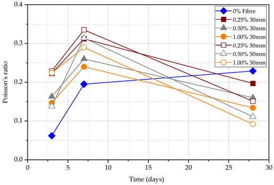 The flexural and shear stiffness of concrete elements should be calculated to assess the lateral displacements and deflections. Steel fibres provide great advantages in high-rise concrete buildings and long-span concrete bridges []. The modulus of elasticity and the Poisson’s ratio are the most important mechanical properties to consider determining the flexural and shearing stiffness of concrete structures []. Vertical deflections and story drift at the service limit state directly relate to the elastic stiffness of the concrete elements. Poisson’s ratio is commonly assumed to be equal to 0.20 in most building codes for estimating the modulus of elasticity of plain concrete, (i.e., without fibres). According to Kumar et al. and Najm et al. [,,] and fibres are used to improve toughness, ductility, and residual strength at the material level, yield capacity, energy absorption, and yield strength at the structural level. Steel fibres are now used in a wide range of construction projects, from high-performance concrete structures to ultra-high-performance concrete structures []. Parra-Montesinos [] argued that high-performance fibre-reinforced concrete (FRC) is suitable for structural members where an adequate seismic behaviour is required.