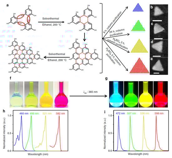 - Yuan, F.; Yuan, T.; Sui, L.; Wang, Z.; Xi, Z.; Li, Y.; Li, X.; Fan, L.; Tan, Z.; Chen, A.; et al. Engineering triangular carbon quantum dots with unprecedented narrow bandwidth emission for multicolored LEDs. Nat. Commun. 2018, 9, 2249. [Google Scholar] [CrossRef] [PubMed]