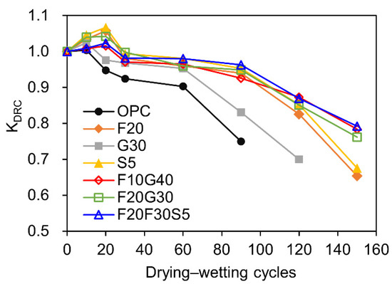 Figure 3 presents the evolution of K D R C of concrete with different mix proportions subjected to DW cycles in 5% Na2SO4 solution. The corresponding fitting functions are given in Table 8. It can be seen that the K D R C first increases and then decreases. The increase is mainly owed to refinement effects due to the formation of expansive products in the core of the examples, while the degradation is due to cracking caused by the continuous formation of expansive compounds [61,62]. Similar deterioration behavior of compressive strength has already been reported by several researchers [36,63,64,65,66]. Additionally, it is evident that the concrete without any mineral admixtures (100% OPC concrete) has the most aggressive influence on the K D R C (i.e., down to 75% of original value after 90 DW cycles). The K D R C of concrete containing single mineral admixture drops faster than the composite mineral admixture after reach the peak value, and the concrete of F20G30S5 has the lowest decline rate of the K D R C . The results suggest that the composite mineral admixture (F10G40, F20G30, and F20G30S5) had a more effective influence on K D R C compared to single mineral admixture (F20, G30, and S5).