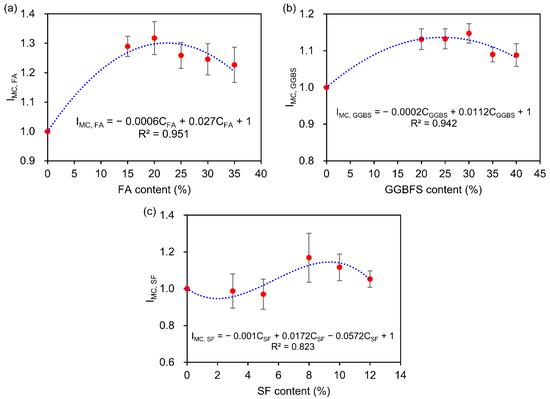 where I M C ,   F A , I M C , G G B S , and I M C , S F are the influence coefficients of concrete with different FA, GGBS, and SF contents; C F A , C G G B S , and C S F in % are the contents of FA, GGBS, and SF.